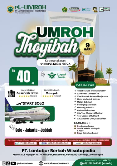 Paket Umroh Tayyibah adalah pilihan perjalanan ibadah yang dirancang untuk memberikan kenyamanan, kekhusyukan, dan pengalaman spiritual maksimal kepada jamaah dengan harga yang kompetitif. Dengan fasilitas terbaik di kelasnya paket ini menggunakan hotel Mekkah & hotel Madinah bintang 5 dan 4/setaraf.
